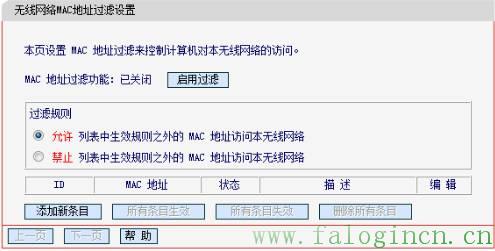 條目添加完成后,啟用MAC地址過濾功能。此時,無線MAC地址過濾設置中條目如下圖: