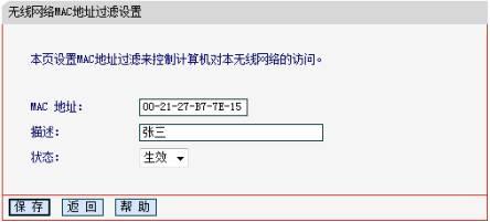 點擊“添加新條目”按鈕,MAC地址為“00-21-27-B7-7E-15”,類型為“允許”,狀態為“生效”的條目。為了方便管理,描述一項中可以添加說明。譬如該地址為張三的電腦,則可以在描述中填寫“張三”。