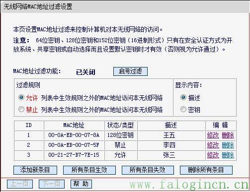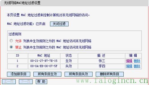 同理,在第二個“添加新條目”中,添加MAC地址為“00-0A-EB-00-07-5F”,描述為“李四”,狀態為“失效”的條目。