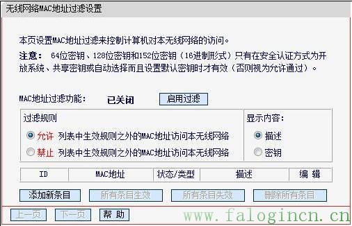 條目添加完成后,再啟用MAC地址過濾功能。此時,無線MAC地址過濾設置中條目如下圖: