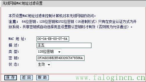 點擊“添加新條目”按鈕,添加MAC地址為“00-0A-EB-00-07-8A”,類型為“128位密鑰”,密鑰為” 2F34D20BE2E54B326C5476586A”,狀態為“生效”的條目。為了方便管理,描述一項中可以添加說明。譬如該地址為王五的電腦,則可以在描述中填寫“王五”。