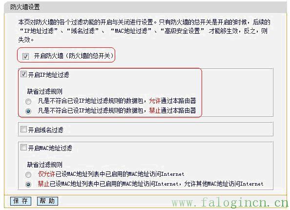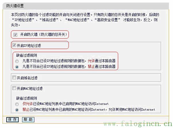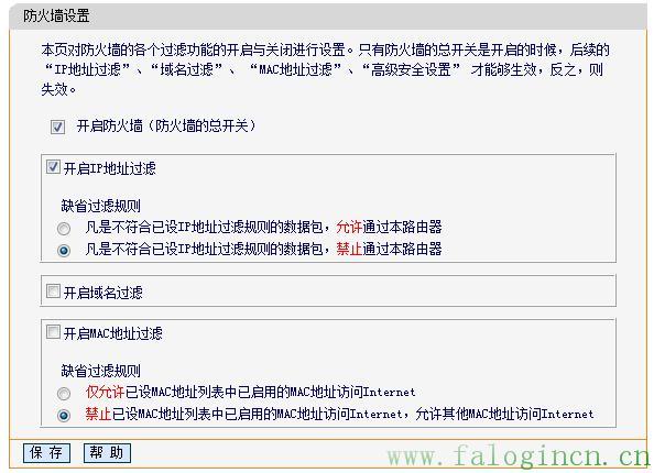 開啟IP地址過濾功能時,必須要開啟防火墻總開關,并明確IP地址過濾的缺省過濾規則(設置過程中若有不明確處,可點擊當前頁面的“幫助”按鈕查看幫助信息):