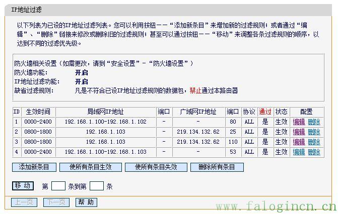 因默認規則為“禁止不符合IP過濾規則的數據包通過路由器”,所以內網電腦IP地址段:192.168.1.100-192.168.1.102不需要進行添加,默認禁止其通過。