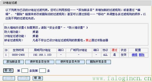 1. 選擇缺省過濾規則為:凡是不符合已設IP地址過濾規則的數據包,禁止通過本路由器: