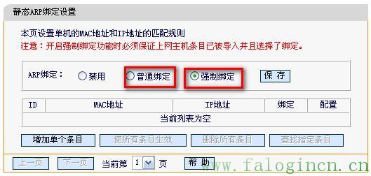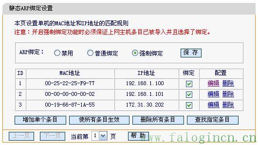 強制綁定:是指關閉路由器的學習IP與MAC地址能力,手動在路由器中添加計算機IP與MAC地址。所以在設置了強制綁定后,新接入路由器的計算機,若沒有添加IP與MAC地址對應關系,該計算機是不能與路由器進行通訊的。或者路由器下的計算機更改了其IP地址,導致與路由器上記錄的IP與MAC對應關系不一致,也無法進行通訊。