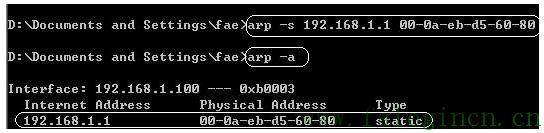 通過“arp –s 路由器IP+路由器MAC”這一條命令來實現對路由器的ARP條目的靜態綁定,如:arp –s 192.168.1.1 00-0a-eb-d5-60-80;可以看到在arp -a 命令的輸出中,已經有了我們剛才添加的條目,Type類型為static表示是靜態添加的。至此,我們也已經設置了電腦的靜態ARP條目,這樣電腦發送到路由器的數據包就不會發送到錯誤的地方去了。