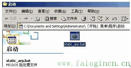保存就可以了,以后可以通過雙擊它來執行這條命令,還可以把它放置到系統的啟動目錄下來實現啟動時自己執行。打開電腦“開始”->“程序”,雙擊“啟動”打開啟動的文件夾目錄,把剛才建立的static_arp.bat復制到里面去: