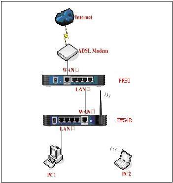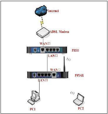 2)寬帶線〈-〉ADSL MODEM〈-〉FR50(LAN口)〈-〉(LAN口)FW54R(無線)〈-〉電腦