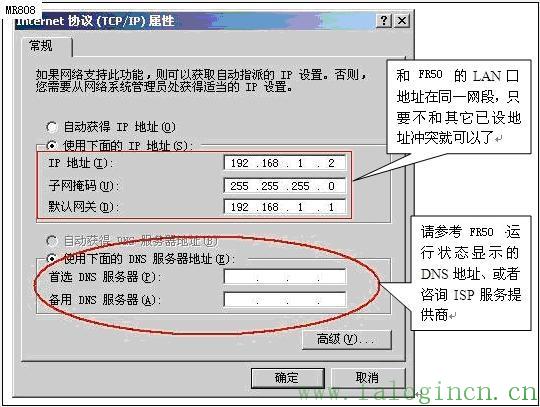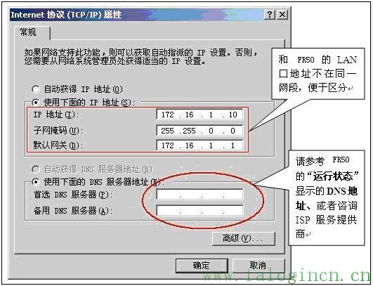 接下來通過無線或者有線方式連接FW54R和電腦,上面兩步配置完以后,FW54R就相當于一臺“無線交換機”,所有通過有線或者無線方式連接在FW54R上面的電腦的TCP/IP屬性要和FR50保持一致!相當于所有電腦是直接連接在FR50 LAN口下,電腦的TCP/IP屬性參數配置如下圖所示: