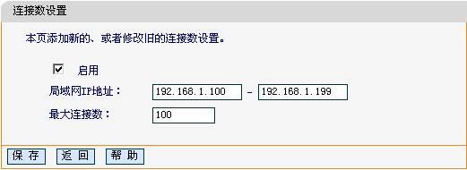 在“局域網IP地址”欄中填入IP地址,可以是一個IP地址段,或一個IP地址,然后填入最大連接數,保存即可。