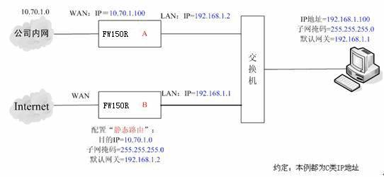 在一個公司網絡中,不僅可以通過無線路由器B連接外網,還可以通過無線路由器A來連接公司內網服務器。在不修改本地連接的IP地址及網關情況下,公司電腦需要能夠同時訪問外網和內網服務器。配置實例如下圖: