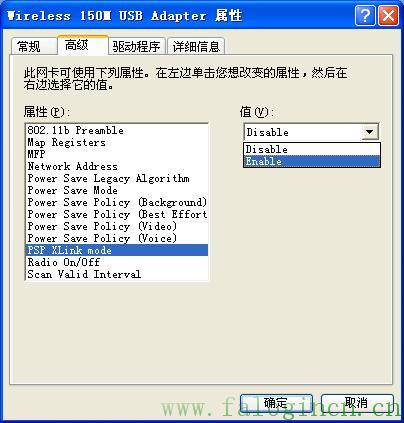 首先安裝好FW150U無(wú)線網(wǎng)卡驅(qū)動(dòng),然后打開(kāi)“設(shè)備管理器”-“網(wǎng)絡(luò)適配器”,在“Wireless 150M USB Adapter”上右鍵點(diǎn)“屬性”,然后打開(kāi)“高級(jí)”選項(xiàng)卡,把“PSP XLink mode”改為“Enable”,默認(rèn)是“Disable”。