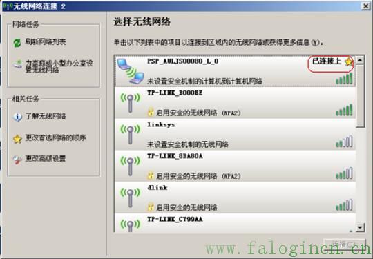 開(kāi)啟PSP的WIFI開(kāi)關(guān)“WLAN”,進(jìn)入游戲,選擇“聯(lián)網(wǎng)模式”。打開(kāi)電腦的“網(wǎng)絡(luò)連接”,右鍵點(diǎn)擊“無(wú)線網(wǎng)絡(luò)連接”,選擇“查看可用的無(wú)線連接”,在當(dāng)前可用的網(wǎng)絡(luò)列表中掃描到PSP,點(diǎn)擊“連接”,連接成功后能夠看到如下信息: