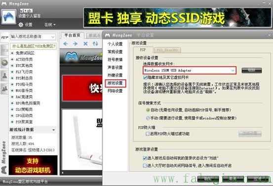 對(duì)戰(zhàn)平臺(tái)有很多,本例以盟區(qū)對(duì)戰(zhàn)平臺(tái)為例。首先進(jìn)入http://www.mengzone.com/網(wǎng) 站,免費(fèi)注冊(cè)一個(gè)用戶名和昵稱,昵稱就是你在游戲中的名字。然后下載游戲平臺(tái)客戶端軟件,在本機(jī)上安裝好。打開(kāi)桌面上的客戶端,輸入剛注冊(cè)的用戶名和密碼,然后選擇登錄服務(wù)器,確定后就進(jìn)入了游戲主界面,在首頁(yè)中點(diǎn)擊游戲設(shè)置,在接收設(shè)備設(shè)置上選擇我們安裝的無(wú)線網(wǎng)卡(Wireless 150M USB Adapter)。如圖: