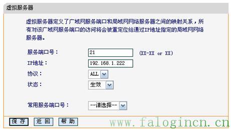 1、 設置虛擬服務器:打開路由器設置界面,在“虛擬服務器”里面,將21端口和80端口分別映射給內網的FTP服務器和WEB服務器,如圖所示: