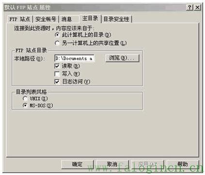點擊“主目錄”選項卡,在FTP站點目錄的“本地路徑”處填上要設置的共享文件路徑。默認情況下,此處的文件夾位置為“C :\Inetpub\Ftproot”,如果臨時想改變共享目錄,隨時都可在此處修改,以后別人登錄FTP服務器時顯示的文件列表就是在這個目錄中。 在“主目錄”的選項卡中,還可設置FTP服務器的文件訪問權限,分別有讀取、寫入和記錄訪問。安全起見,這里的寫入權限一般不選,保證匿名用戶不能隨意對文件進行操作。設置登錄的用戶。如果要提供“匿名”訪問的權限,還需在“安全賬戶”選項中選擇“允許匿名連接”選項。此外,還可從Windows2000 服務器的用戶賬號(控制面板→管理工具→計算機管理→本地用戶和組)中選擇FTP服務器的特殊賬號,當然也可以自己設置用戶名和密碼。在“消息”選項卡中,有“歡迎”、“退出”和“最大連接數”3個輸入框,分別代表別人在登錄、退出時FTP服務器給出的提示信息,這可以根據自己的需要設置,最大連接數是設置同時連接本地FTP的最大主機臺數。在“FTP站點”選項卡中設置FTP標識,包括說明、IP地址和端口,在“描述”文本框中,把“默認FTP站點”改為FTP站點名稱,其它的一般不需要改動,按照默認選項即可。