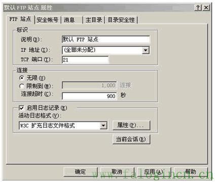 5、FTP服務器: IIS中帶有一個FTP服務器。在“控制面板”的“管理工具”中,啟動IIS,并啟動IIS上的FTP服務。在默認情況下,FTP服務器已經搭建好了,并且可以立即登錄,但是該FTP中沒有任何文件。右擊IIS中的“默認FTP站點”節點,選擇“屬性”命令,打開相應的屬性設置對話框。