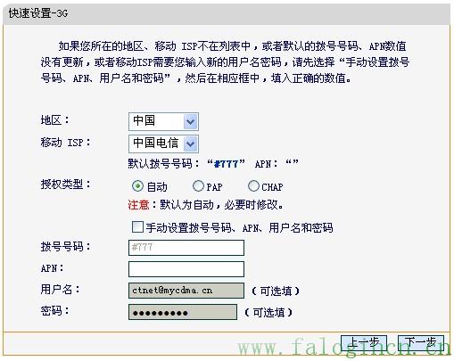 這里我們選擇“3G路由模式”,點擊“下一步”,配置3G撥號參數,地區選擇“中國”,移動ISP:可選“中國電信”、“中國移動”和“中國聯通”(根據你的上網卡制式來選擇),其他默認設置不用修改。