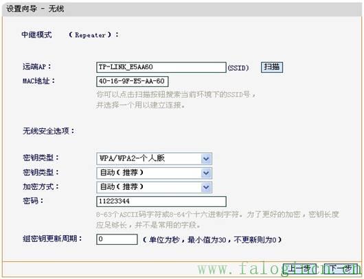 步驟2:填入遠端AP的ssid、mac地址或者點擊掃描,在彈出的列表當中選擇要中繼的前端路由器的SSID號進行連接,并輸入與前端路由器相同的加密類型及密鑰。