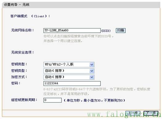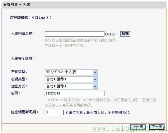 點擊掃描,在彈出的列表當中選擇FWR171-3G的SSID,并選擇與FWR171-3G相同的加密類型及填入正確的密鑰,如圖所示:
