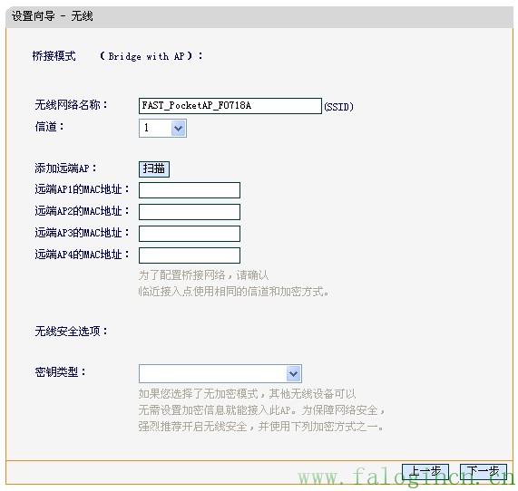 注:在FWR171-3G在選擇橋接模式(Bridge with AP),支持的加密類型如下:WEP、無加密、不修改無線安全設置。(此例選擇WEP進行無線加密)