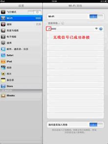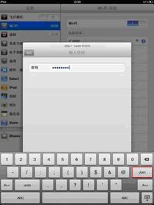 l 輸入您之前設好的無線密碼,點擊Join。等無線信號列表中相應的SSID前顯示"√"時,就可以用iPad上網(wǎng)了。