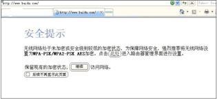 按照步驟二的方法將您的電腦通過無線的方式連接到路由器后,就可以上網(wǎng)了。如果電腦在打開網(wǎng)頁時有如下頁面的"安全提示"信息,表示您的無線沒有進行加密或者沒有選擇足夠安全的加密方式,請按該頁面的提示設置無線安全。