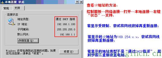 經(jīng)過上面的配置后,您的電腦就會自動向路由器"索要"IP地址,路由器也會在接收到請求后分配參數(shù)給電腦,成功后點擊電腦右下角的小電腦圖標,在本地連接狀態(tài)的"支持"選項卡里可以看到電腦獲取的參數(shù),如下圖(以XP系統(tǒng)為例):