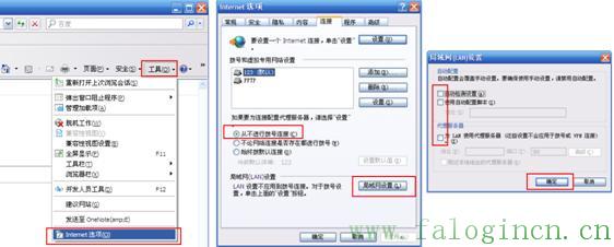 l 檢查瀏覽器設置(瀏覽器里點擊"工具--Internet選項",選擇"連接"選項卡,選擇"從不進行撥號連接"后點擊"局域網(wǎng)設置",保證里面的三項全部都不勾選的狀態(tài)下,點擊確定)或者換一個瀏覽器(如火狐瀏覽器、谷歌瀏覽器)后再嘗試,如果仍然不能管理,嘗試換一臺電腦來訪問。