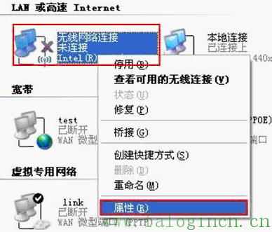 2. 右鍵點擊“無線網絡連接”,選擇“屬性”。