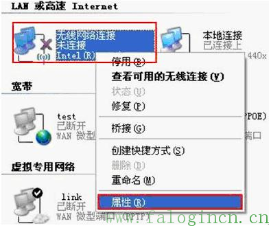 2. 右鍵點擊“無線網絡連接”,選擇“屬性”。