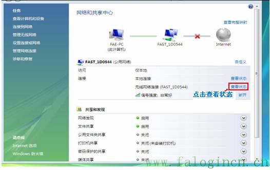 第二步:在對應的網絡連接后點擊“查看狀態”。(也可以點擊“管理網絡連接”,如果您是通過有線的方式連接路由器,右鍵單擊“本地連接”選擇“屬性”,如果您是通過無線連接路由器,請在“無線網絡連接”上右鍵選擇“屬性”,這里以無線為例。)