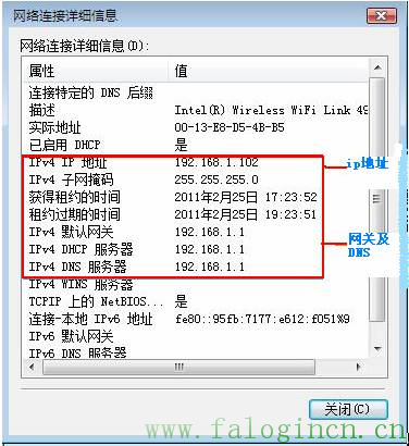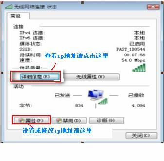 這里可以查看本機無線網絡連接的IP地址等信息,請檢查IP地址、網關、DNS服務器地址是否配置正確,正確配置為: