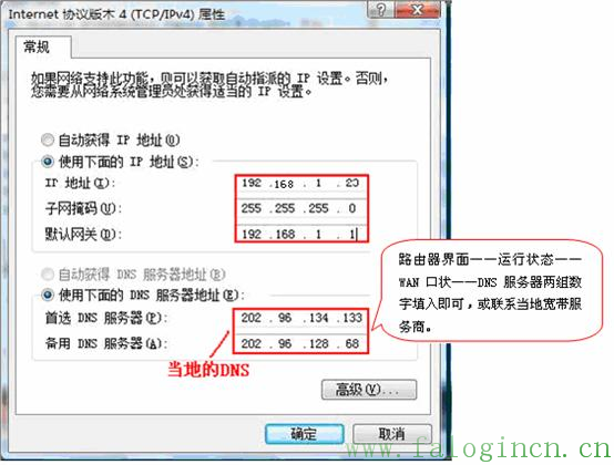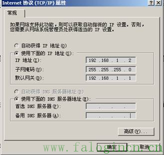 選擇“屬性”→“常規”→“Internet協議(TCP/IP)”,查看其“屬性”,您會看到如下頁面,請按圖所示,填入IP地址192.168.1.2,子網掩碼255.255.255.0,默認網192.168.1.1。點擊該頁面的“確定”及“本地連接屬性”頁面的“確定”。等待系統配置完畢。注意在 “使用下面的DNS服務器地址”中填入當地的DNS服務器地址。