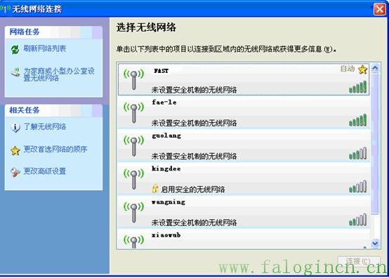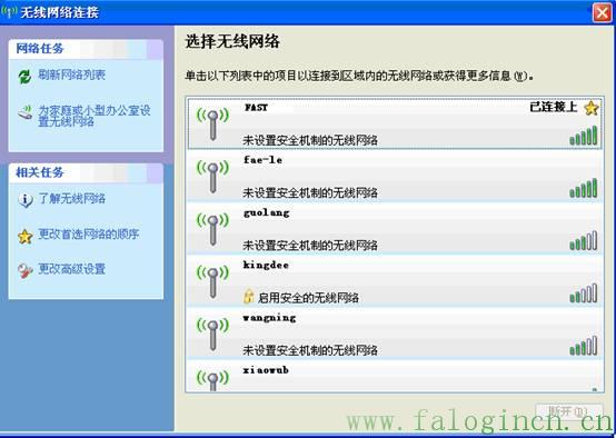右鍵點擊“無線網絡連接”—“屬性”-“無線網絡配置”-“查看無線網絡”,你將會獲得當前無線網卡搜索到的無線信號,選擇需要連接的進行連接,如下圖中,SSID為FAST的無線信號。點擊進行連接,即可成功完成無線信號的連接。