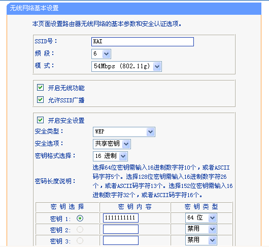 首先在路由的器的配置界面,無線網絡基本設置中,已經對SSID號,開啟安全設置,安全類型,安全選項,密碼進行了設置: