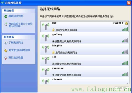 右鍵點擊“無線網絡連接”—“屬性”-“無線網絡配置”-“查看無線網絡”,選擇需要連接的無線網絡,進行連接,如下圖中,SSID為KAI的無線信號。點擊進行連接,即可成功完成無線信號的連接: