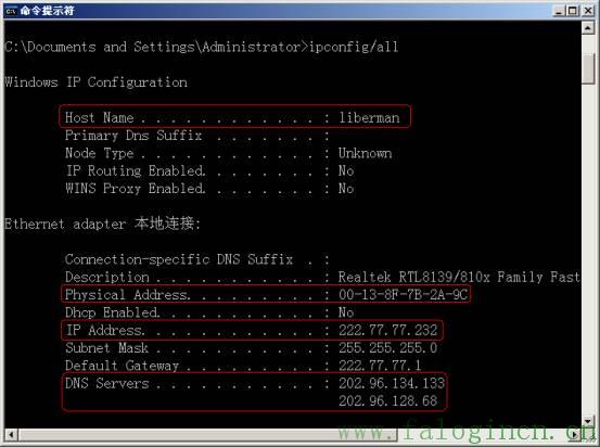 要發(fā)現(xiàn)和解決TCP/IP網(wǎng)絡(luò)問(wèn)題時(shí),通常首先檢查出現(xiàn)問(wèn)題的計(jì)算機(jī)上的TCP/IP配置。使用ipconfig /all命令可獲得全面的主機(jī)配置信息,如下圖所示。既包括總體的IP配置信息,如主機(jī)名、IP地址、DNS、MAC地址等。