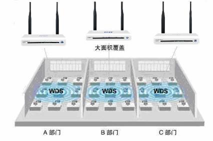 上圖所示為一小型企業無線網絡,A、B、C三個部門如果只使用1個無線路由器(本文以FW300R為例),可能會出現一些計算機搜到信號很弱或者搜索不到信號,導致無法連接無線網絡。解決方法是:A、B、C三個部門各自連接一臺無線路由器,三個無線路由器通過WDS連接就可以實現整個區域的完美覆蓋、消除盲點。